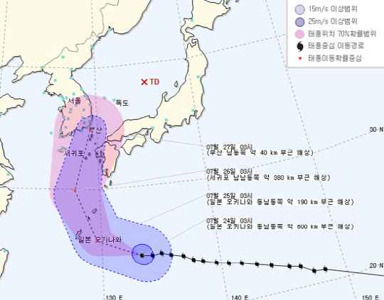 기상청은 "태풍은 한반도를 스쳐 지날 것으로 보이지만, 향후 진로가 달라질 수도 있으니 기상예보에 관심을 기울여달라"고 당부했다. <스포츠조선닷컴>