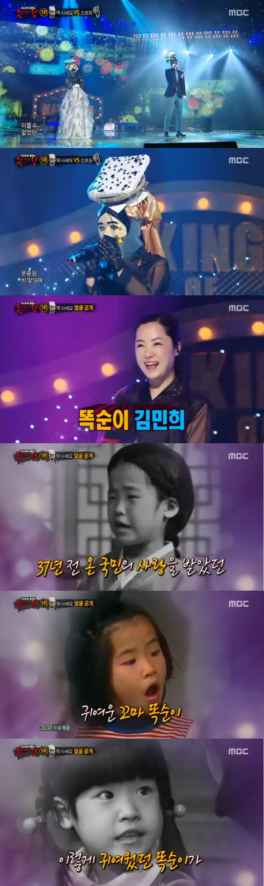 김민희는 아쉬운 탈락 무대를 가진 후 "어려서 일찍 데뷔해 꿈이 없었다. 자고 일어나니 스타가 돼 있었다"며 "똑순이 타이틀 너무 감사한데 몸에 안 맞게 살았다. 유일하게 갖고 있는 꿈이 가수였다. 젊었을 때는 불발됐고, 지금은 나이가 많아서 못했다. 편견 없이 부르고 싶었다"고 출연 소감을 전했다.