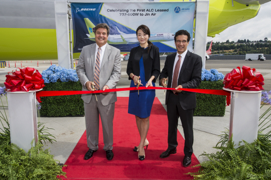 진에어(대표 마원)가 27일(현지시각) 미국 시애틀에 위치한 보잉 딜리버리 센터(Boeing Delivery Center)에서 신규 제작한 B737-800 항공기 1대의 인수식을 갖고 첫 신규 제작 항공기를 도입했다.