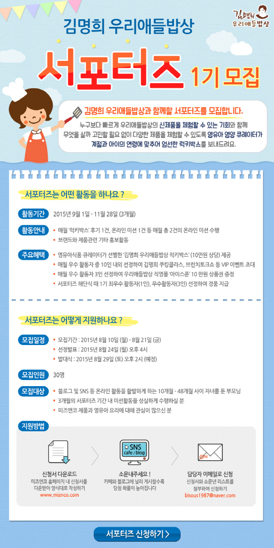 대한민국 최초 벤처인증을 받은 영유아 어린이 식품개발전문 업체 (주)미즈앤코(대표 권오윤)의 '김명희 우리애들밥상'에서 공식 서포터즈 1기를 모집한다.