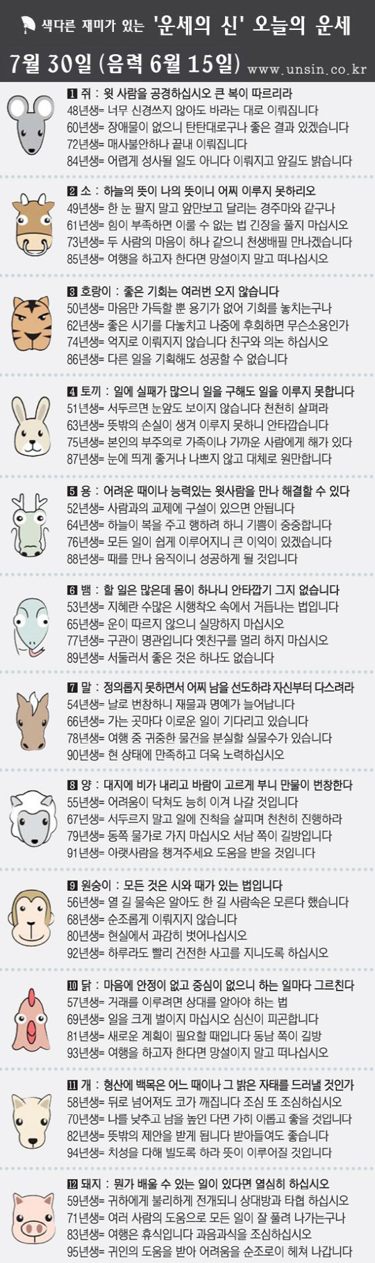 [직장인을 위한 오늘의 운세] 2015년 7월 30일 목요일(음력 6월 15일)