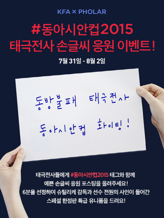 폴라는7월 31일부터 8월 2일까지 3일간 '동아시안컵 손글씨 응원 이벤트'를 진행한다. 이벤트에 참여하길 원하는 사람은 동아시안컵에 출전한 우리나라 대표팀을 응원하는 메시지를 나만의 손글씨로 적어 폴라에 포스팅하면 된다. 이 중 추첨을 통해 선정된 이들에게는 동아시안컵 남녀 국가대표 싸인 유니폼이 경품으로 제공된다.
