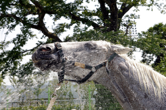 | ◇말은 추위에는 강하지만 더위엔 약하다. 때문에 관리사들은 경주마가 더위에 지치지 않도록 자주 샤워를 시키고 먹는것도 신경을 쓰곤 한다. 훈련을 마치고 샤워 중에 얼굴에 물을 맞으면서 더위를 식히고 있는 경주마의 모습. 사진제공=한국마사회 |