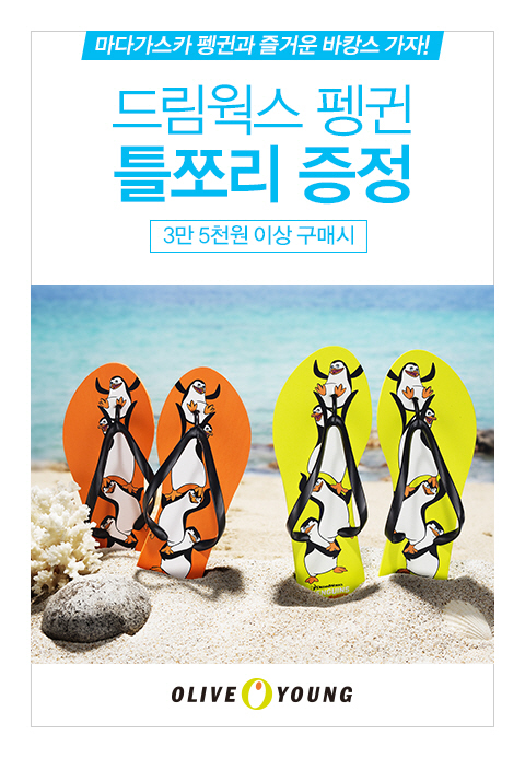올리브영이 기획한 드림웍스 펭귄 틀쪼리는 '마다가스카의 펭귄' 속 캐릭터 일러스트를 톡톡 튀는 네온 컬러와 조화롭게 디자인한 샌들이다. 사각 틀에서 쪼리를 떼어내 착용하고, 보관 시에는 다시 틀에 끼워 간편하게 사용할 수 있다. 컬러는 오렌지와 그린 두 가지이며, 3일부터 소진시까지 전국 매장에서 3만5000원 이상 구매 고객 대상으로 선착순 증정한다. 올리브영의 자체 브랜드인 드림웍스 뷰티 컬렉션은 출시 이후 꾸준히 인기를 얻고 있다.