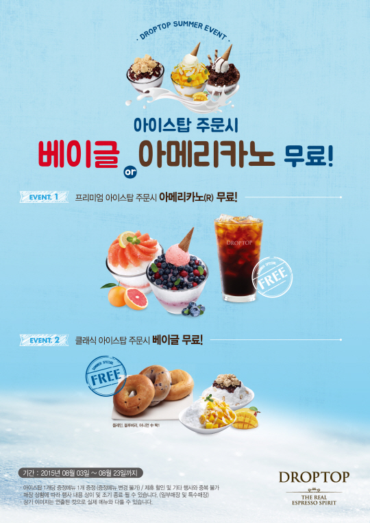 氷(빙) 아이스탑 이벤트는 2인용 우유빙수 '클래식 아이스탑'을 구매하는 고객에게는 무조건 베이글 1개를, 3~4인용 우유빙수 '프리미엄 아이스탑'을 구매하는 고객에게는 무조건 아메리카노 1잔을 무료로 제공하는 행사다. 3일부터 23일까지 3주 동안 전국 드롭탑 매장에서 진행한다.(특수 매장 등 일부 매장 제외)