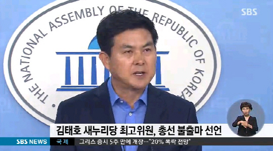 3일 김태호 최고위원은 국회 기자회견장을 찾아 "우리 경제의 어려움으로 견디기 힘든 세월을 겪고 계시는 국민 여러분께 죄송하고 두려운 마음으로 이 자리에 섰다"면서 "저는 내년 20대 총선에 출마하지 않기로 하였다"고 밝혔다.
