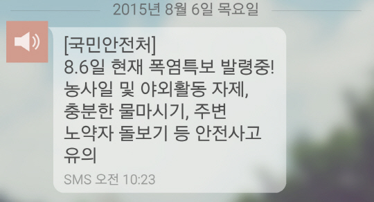 국민안전처는 농사일 및 야외활동을 자제할 것을 당부하며, 물을 충분히 마시고 주변 노약자에 주의를 기울일 것을 촉구했다. 또 물놀이 안전사고에 대비할 것을 알렸다.