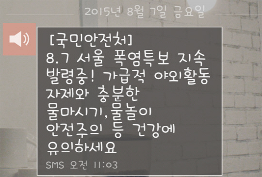 국민안전처가 긴급재난 문자로 폭염특보를 알렸다.