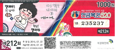 제212회 '연금복권520' 1등 당첨의 행운은 정년퇴직을 1년 6개월 앞둔 50대 남성에게로 돌아갔다.