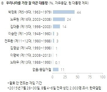 여론조사 전문업체 한국갤럽은 광복 70주년을 맞아 지난달 28~30일, 이번달 4~6일 전국의 성인 2003명에게 '전직 대통령 중 해방 이후 우리나라를 가장 잘 이끈 대통령이 누구라고 생각하는지' 물었다(자유응답).