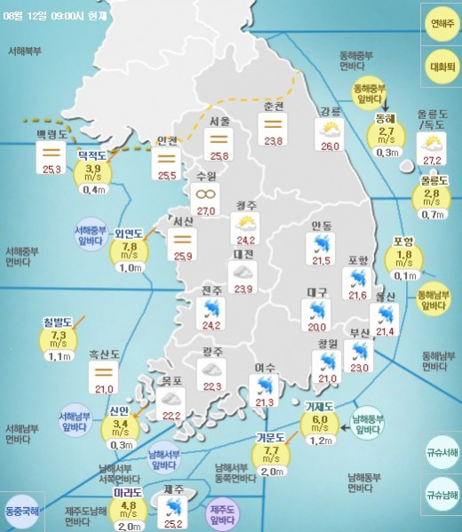 12일 기상청에 따르면 경상남도와 제주도는 오전까지 비가 오겠으며, 경북남부와 경북동해안은 비가 오다가 오후부터 점차 그치겠다"고 예보했다.