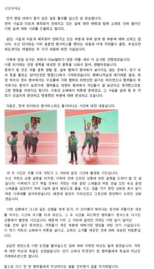어렵게 발걸음을 한 팬들과 사진촬영을 하지 않았다는 지적에 대해선 "앞선 오해에 의해 많은 팬들이 자리를 뜬 이후 티아라가 팬석으로 다가왔다"면서 "이 역시 저희의 오해에서 비롯된 일"이라고 미안함을 전했다.