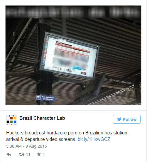 11일(현지시간) 영국 매체 '미러' 등 외신들에 따르면 8일 브라질의 보케이라옹 정거장에 설치된 모든 여행 정보 화면에 하드코어 포르노가 약 15분 동안 방송됐다.
