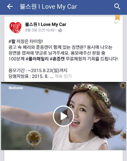 총 100명에게 폴라패밀리 탈취항균 훈증캔 에어컨히터용을 무료로 체험할 수 있는 기회를 주는 이번 이벤트는 불스원 페이스북 페이지(https://www.facebook.com/Bullsonekorea)에서 오는 23일까지 진행된다. 이벤트 신청방법도 간단하다. 불스원 페이스북 페이지에서 폴라패밀리 탈취항균 훈증캔 CF영상을 시청하면서 폴라패밀리 브랜드 모델인 걸스데이 혜리와 훈증캔이 함께 나오는 장면을 캡처해 이벤트 공지글의 댓글로 남기면 응모가 완료된다.
