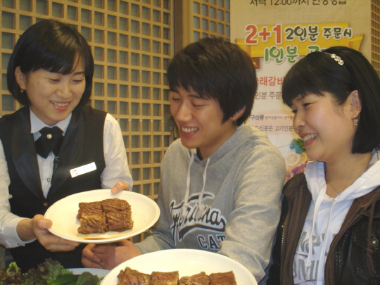 13일 강강술래에 따르면 서초점과 여의도점은 한우모둠구이·왕양념갈비·한우광양불고기, 역삼점은 왕양념갈비 메뉴를 2인분 시키면 1인분을 추가 증정하는 2+1 덤 증정 행사를 진행한다.