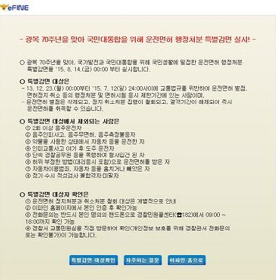 한편 교통범칙금 과태료 조회·납부시스템으로 2012년에 개설된 '이파인(www.efine.go.kr)'에 접속하면 별도의 회원가입 없이 본인 명의의 공인인증서로 로그인 해 교통범칙금·과태료의 편리한 납부, 최근 무인단속 내역조회, 무인단속 통지서 발급조회, 교통범칙금·과태료 인터넷납부 지원, 이의신청·과오납 환급 등 민원신청, 운전면허 정보조회, 운전면허 적성검사(갱신)기간 조회, 벌점조회, 운전경력증명서 발급, 교통사고사실확인원 발급, 착한운전마일리지제 신청 등 다양한 조회 및 납부가 가능하다. <스포츠조선닷컴>