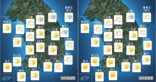 이날 아침 예상 최저기온은 △서울 23도 △대전 21도 △부산 23도 △대구 22도 △광주 22도 등으로 전날과 비슷하다. 낮 예상 최고기온은 △서울 31도 △대전 31도 △부산 30도 △대구 32도 △광주 32도 등으로 전날보다 조금 높다. <스포츠조선닷컴>