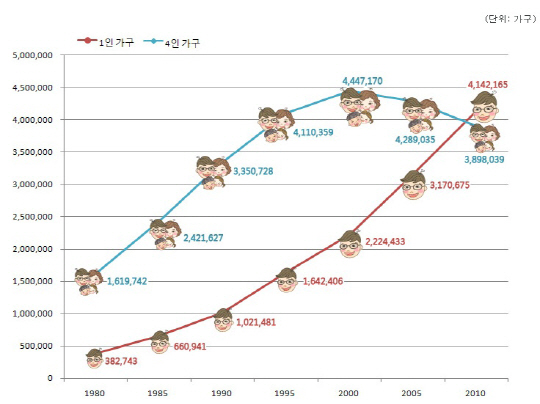 미혼 및 이혼으로 1인 가구가 급증했다. 미혼 1인 가구는 2000~2010년 동안 연평균 6.8% 증가했고 이혼 1인 가구는 같은 기간 연평균 9.8% 증가했다.