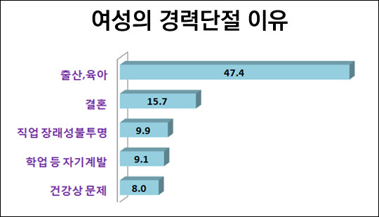 경력 단절 이유로는 출산 육아라는 답변이 47.4%에 달했다. 결혼(15.7%), 직업장래성 불투명(9.9%) 순이었다.