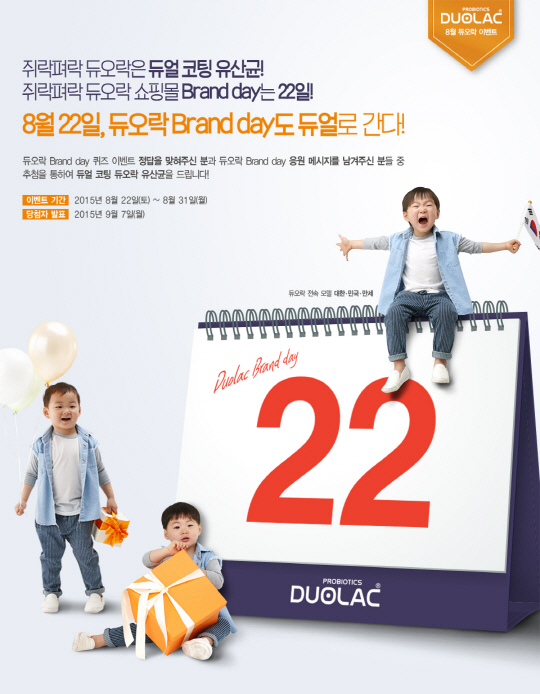 '듀오락 브랜드 데이' 이벤트는 누구나 쉽게 참여 가능한 '빈칸 채우기 퀴즈 이벤트'와 '듀오락 브랜드 데이 응원 메시지 이벤트'로 구성돼 있다. 퀴즈 정답자와 응원 메시지 작성자 중 추첨을 통해 각각 20명에게 '듀오락 지사랑' 1개월분을 증정한다. 이벤트는 모두 듀오락몰(www.duolac.co.kr)에서 진행된다.