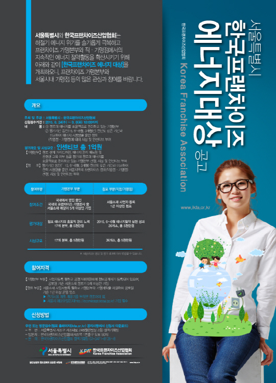 한국프랜차이즈산업협회(회장 조동민)와 서울시(시장 박원순)가 19일 에너지 위기를 슬기롭게 극복하고, 프랜차이즈 가맹본부 및 직·가맹점에서의 지속적인 에너지 절약활동을 확산시키기 위해 '한국프랜차이즈 에너지대상'을 공모한다고 밝혔다.