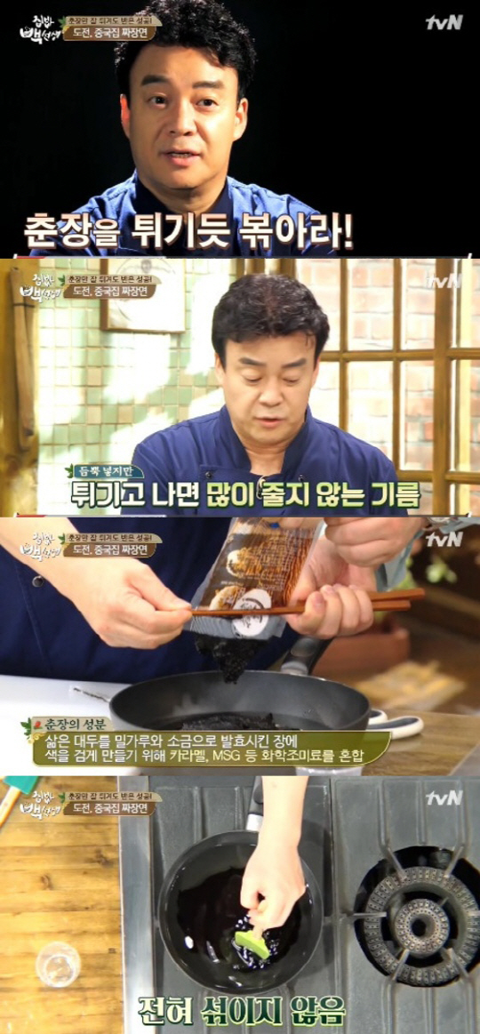 백종원은 "춘장만 잘 쓰면 밖에서 사먹는 짜장면의 90% 맛을 낼 수 있다. 보통 춘장을 볶는다고 알고 있는데 튀기는 것이다. 오랜시간 튀기는 것이 좋다"고 말했다.