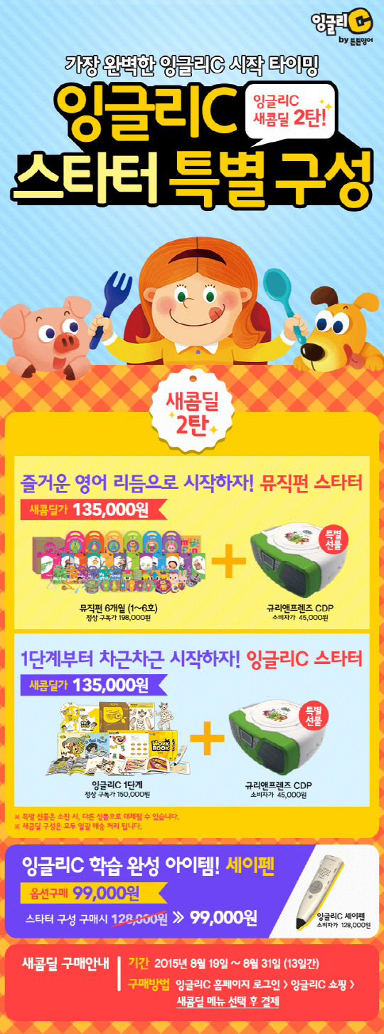 고객들의 성원에 힘입어 성공적으로 진행된 1차 프로모션에 이어 두 번째로 준비된 '새콤딜' 2탄은 잉글리C로 영어를 처음 시작하는 아이들을 위한 특별 구성으로 기획됐다. 즐거운 영어 리듬으로 가볍게 영어를 시작하고자 하는 아이들을 위한 '뮤직펀 6개월(1~6호)' 패키지와 단계별로 차근차근 영어 실력을 쌓고자 하는 아이들을 위한 ' 잉글리C 6개월(1단계)' 패키지로 나뉘어 진행되며 두 제품 모두 특별가 13만5000원에 구독 가능하다. 해당 패키지를 구매하는 고객에게는 4만5000원 상당의 '규리앤프렌즈' CD 플레이어를 무료로 증정한다. 구매 고객들은 뮤직펀, 잉글리C 프로그램과 연동해 활용할 수 있는 전자음성인식기능펜 '세이펜'을 23% 할인된 9만9000원에 구입할 수 있다.