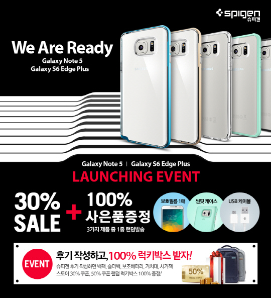슈피겐코리아(대표 김대영)가 갤럭시노트5·S6엣지플러스 출시를 기념해 9월 15일까지 슈피겐 공식스토어 및 온라인 오픈마켓을 통해 '투명케이스 런칭 프로모션'을 실시한다.