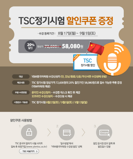 이 외에도 YBM어학원의 강남·종로·신촌·서면 중국어 전문센터에서는 9월 수강 등록생 전원에게 TSC 정기시험 응시료 20% 할인 쿠폰을 증정한다. 해당 쿠폰은 9월 5일 및 13일 TSC정기시험에 사용 가능하며, TSC 접수페이지에서 쿠폰 번호를 입력하면 할인된 금액이 적용된다.