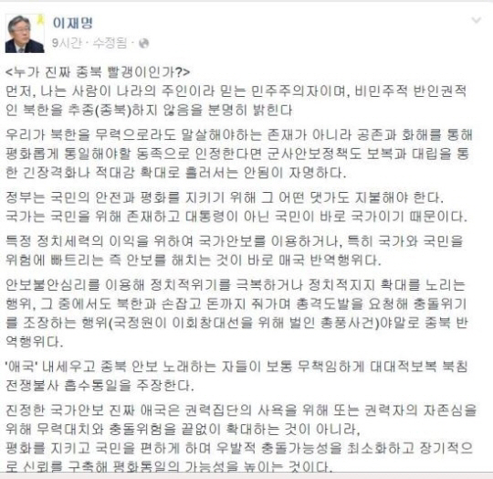 이재명 성남시장은 "우리가 북한을 무력으로라도 말살해야하는 존재가 아니라 공존과 화해를 통해 평화롭게 통일해야할 동족으로 인정한다면 군사안보정책도 보복과 대립을 통한 긴장격화나 적대감 확대로 흘러서는 안됨이 자명하다"며 "정부는 국민의 안전과 평화를 지키기 위해 그 어떤 댓가도 지불해야 한다. 국가는 국민을 위해 존재하고 대통령이 아닌 국민이 바로 국가이기 때문이다"고 말했다.