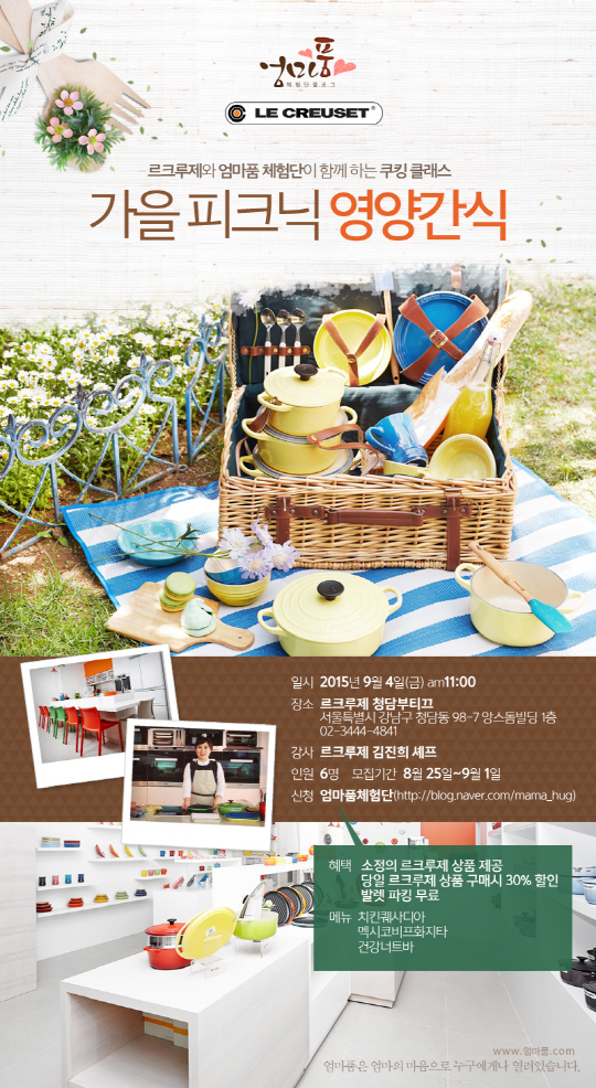 르크루제는 9월 4일 오전 11시 서울 강남구 청담동 르크루제 청담 부티끄에서 '가을 피크닉 영양간식'을 주제로 엄마품체험단 선정 블로거들을 대상으로 쿠킹 클래스를 시연한다. 이날 선보일 영양간식 메뉴는 치킨퀘사디아, 멕시코비프화지타, 건강너트바 등 3종이다. 아이들이 맛있게 먹고, 좋아할 뿐만 아니라 필요한 영양소를 골고루 섭취할 수 있게 해주는 영양만점 간식 매뉴들로 구성했다. '가을 피크닉 영양간식' 쿠킹 클래스는 르크루제 전속 김진희 셰프가 진행하며 참가자들에게 간편 레시피와 다양한 요리팁을 전수할 예정이다. 참가자들에겐 르크루제와 엄마품체험단이 준비한 소정의 상품과 함께 당일 르크루제 제품 구매 시 30% 할인혜택을 제공한다.