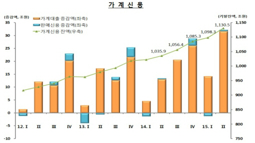 판매신용은 1분기 1조2000억원 감소에서 2분기 5000억원 증가로 전환됐다. 할부금융회사의 판매신용이 전분기 대비 1조원 증가했지만 메르스 여파로 소비가 위축되면서 신용카드회사의 판매신용은 5000억원 오히려 감소했다. <스포츠조선닷컴>