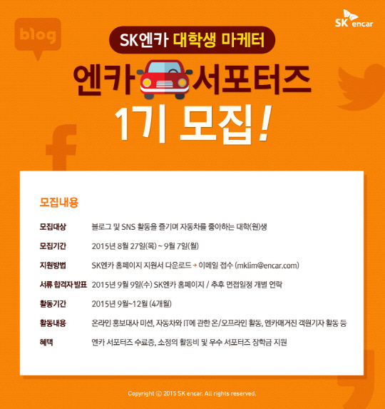 엔카 서포터즈는 오는 9월 7일까지 SK엔카 홈페이지에서 지원할 수 있으며, 대학(원)생 이라면 누구나 참가할 수 있다. 서류 합격자 발표는 9월 9일 SK엔카 홈페이지에서 확인할 수 있다. 최종 합격자는 9월부터 12월까지 약 4개월간 활동하게 된다.