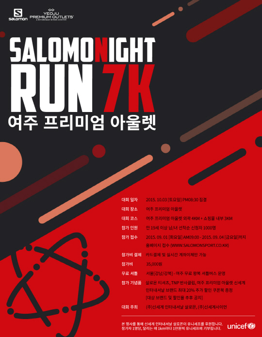 신세계사이먼 프리미엄 아울렛과 스포츠아웃도어 브랜드 살로몬(Salomon)이 10월 3일 밤 9시부터 여주 프리미엄 아울렛에서 이색 러닝 대회인 '살로몬 나이트 런(SalomoNight Run)'을 공동 개최한다.