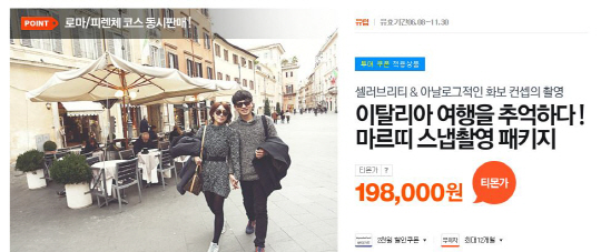 티몬의 올해 8월까지 스냅사진 상품 매출은 작년 동기 대비 43% 늘어났다. 가장 많이 판매된 상품은 이탈리아와 프랑스에서 스냅사진을 찍어주는 것으로 모두 매출이 1000만원을 넘어섰다. 대부분 현지에 한국인 사진작가가 촬영하는 업체들이 운영하며 성인 2인 기준 시간당 10~20만원에 촬영을 하고 추후에 보정된 사진과 원본사진을 함께 받는 서비스다.