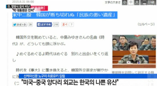 일본 우익 산케이신문이 박근혜 대통령이 중국 전승절 열병식에 참석한 것을 비난하면서, 박 대통령을 일본 낭인들에 살해당한 명성황후로 비유하는 망발을 했다.