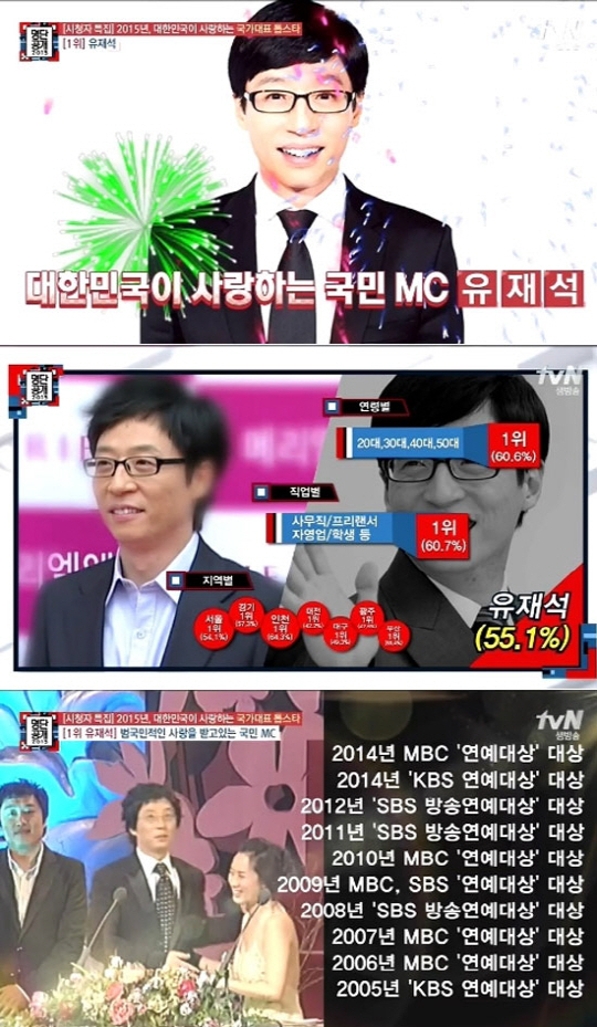 '국민 MC' 유재석은 전 연령대, 전 직업군, 전 지역별에서 1위에 오르는 저력을 과시하며 득표율 55.1%로 당당히 1위에 올랐다.
