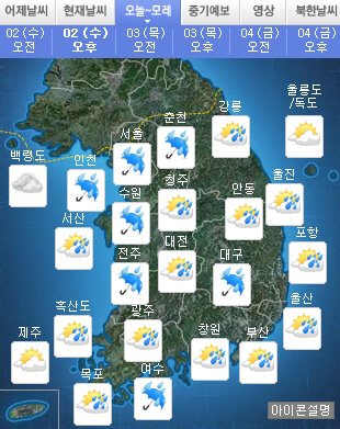 비는 아침에 중부지방에서 시작돼 낮에 남부지방으로 확대됐다가 늦은 밤 대부분 그치겠다.