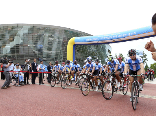 국민체육진흥공단(이사장 이창섭) 경륜경정사업본부는 5일 경기도 광명스피돔에서 '시각 장애인과 함께하는 텐덤사이클 라이딩 대행진' 출정식을 갖는다. 경륜의 사회공헌 사업인 '희망 리스타트'의 일환으로 열리는 이번 행사는 5일 출정식에 이어 오후 2시부터 본격적인 대장정에 나선다. 라이딩은 스피돔을 출발 7일까지 2박 3일간 한강자전거길, 군산과 공주를 거쳐 세종시를 지나 대전 대청댐까지 자전거 전용도로 170㎞를 달리며 진행된다. 참가자들은 텐덤사이클이라 불리는 2인용 자전거에 동승해 앞좌석에는 비장애인이 뒷좌석에는 시각장애인이 타 호흡을 맞춰 동시에 페달을 밟아가며 목표에 도전한다. 짧게는 하루에 20~30㎞에서 많게는 90㎞를 달리며 1일 평균 3~4시간 내외로 라이딩을 벌인다. 광명시 시각장애인 10명을 포함해 광명시 자전거연합회 자원봉사자 등 30여명이 이번 아름다운 동행에 함께한다. 참가자들은 첫날 스피돔에서 동작대교까지 24㎞구간을 라이딩하며 몸을 푼 뒤 군산으로 이동한다. 이어 이튿날 금강하구둑에서 공주까지 91㎞ 구간 도전에 나서고 마지막 날 공주에서 대청댐에 이르는 54㎞을 끝으로 라이딩을 마무리한다. 경륜은 이번 시각장애인들 도전의 성공을 위해 텐덤사이클 제작비 등 2000만원을 지원했다. 경륜관계자는 "일반 시각장애인들이 도전을 통해 삶의 활력을 얻었으면 한다"고 행사의 취지를 밝혔다.
