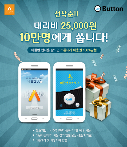 이번 이벤트는 내비게이션 앱 아틀란과 대리운전 앱 업계 1위인 버튼대리의 제휴를 기념하기 위해 마련된 이벤트로, 참가자 중 선착순 10만명에게 대리운전 1회 무료 이용권을 증정한다. 참여 방법도 간단해 구글 플레이 스토어에서 '아틀란3D'를 다운로드 받고 리뷰를 남긴 후, 이벤트 참여하기를 통해 응모하면 된다(http://bit.ly/1J1kPmQ).