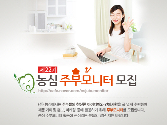 농심이 15일까지 제22기 '농심 주부모니터'를 모집한다. 8일 농심에 따르면 주부모니터 신청은 농심 홈페이지(www.nongshim.com)에서 가능하며, 서울 및 수도권에 거주하는 만28세에서 만48세까지의 전업주부를 대상으로 한다. 주부모니터로 선발되면 월1회 정기 모임을 비롯해 제품평가, 아이디어 제안, 매장조사 등의 활동을 하게 되며, 소정의 활동비와 농심 제품이 제공된다. 활동기간은 올 11월부터 2016년 6월까지 8개월 간이다.