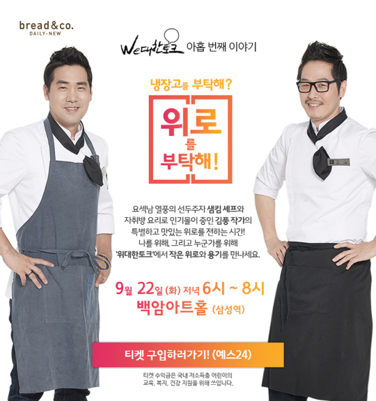 '제9회 위대한 토크'는 오는 9월 22일 '냉장고를 부탁해? 위로를 부탁해' 를 타이틀로, 김풍 작가와 샘킴셰프가 출연할 예정이다. 제9회 위대한 토크는 9월 22일 6시~8시까지 서울 삼성역 8번출구 백암아트홀에서 450명을 대상으로 개최되며 토크와 쿠킹&이벤트가 함께 어우러져 진행된다.