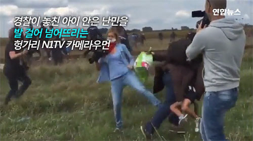 헝가리 카메라우먼, 아이 안고 도망치는 도망치는 난민 걷어차…비난 빗발