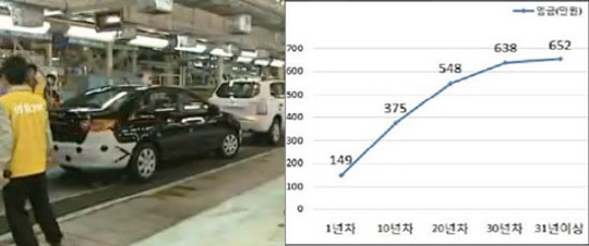 10년차 근로자의 월 평균임금은 375만원, 20년차는 548만원, 31년차 이상은 652만원으로 조사됐다. 이는 각각 1년차 근로자 월평균임금의 2.5배, 3.7배, 4,4배에 해당하는 수준이다.
