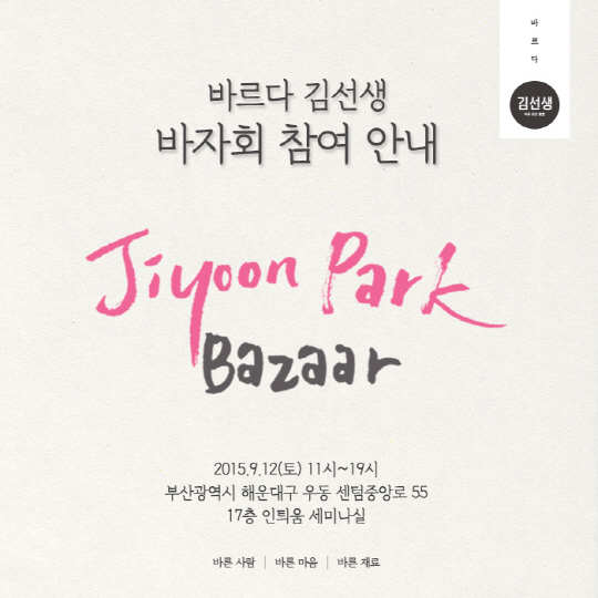 박지윤 바자회는 아나운서 박지윤이 주최하는 행사로 물품 판매수익금을 불우한 이웃에게 전달하는 자선바자회다. 이번 바자회엔 20개 업체가 참여하여 패션, 액세서리, 식품 등 다양한 물품을 판매했다. 바르다 김선생은 국내산 통참깨를 사용해 전통 방앗간 찜누름 방식으로 만든 참기름세트와 바르다 김선생의 주요 메뉴인 바른김밥, 크림치즈호두김밥, 진미김밥을 고객들에게 선보였다. 김밥 메뉴와 참기름세트는 정상 가격보다 최고 37% 할인된 가격으로 판매해, 추석을 앞둔 고객들에게 선물용으로 인기가 높았다. 여기에 행사 취지에 맞게 바르다 김선생은 부산 지역 병원 소아암 환자 수술 지원금을 위해 바자회 판매금액의 50%를 기부할 예정이다.