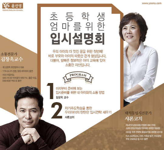 한편, 입시설명회에 참석하려면 윤선생 홈페이지(www.yoons.com) 또는 공식 블로그, 윤스맘 카페를 통해 사전 참가 신청을 해야 한다. 선착순 1000명에 한해 신청 가능하며, 참가비는 무료다. 온라인에서 사전 참가 신청을 한 뒤 행사장을 방문한 학부모에게는 선착순 200명에 한해 스타벅스 기프티콘을 준다. 이외에도 입시설명회 참석자를 대상으로 현장 이벤트를 진행, 갤럭시탭과 강사 저서 등 푸짐한 경품을 증정한다.