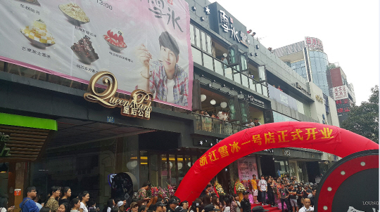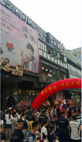 절강성 항주 1호점의 오픈식에 앞서 몰려든 중국팬들이 장사진을 치고 있다. 이들은 설빙의 한국과 중국 모델인 임시완을 보기 위해 오픈식 서너시간전부터 매장 앞을 지키고 있었다.