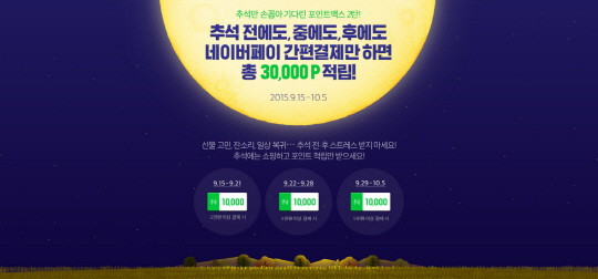 16일 네이버에 따르면 추석 연휴 전(9/15~21), 연휴 중(9/22~28), 연휴 후(9/29~10/5)로 나눠 각각의 기간 내에 네이버페이를 통해 5만원 이상 결제한 이용자들에게 기간 별로 1만 포인트를 지급해 총 3만 포인트까지 적립할 수 있도록 지원할 계획이다.