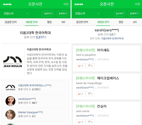 네이버㈜(대표이사 사장 김상헌)는 네이버 오픈사전을 통해 더욱 생생한 현지 신조어 정보를 제공하기 위해 현지 해외 교육 기관과 손잡고 '네이버 오픈사전 협력 프로젝트'를 진행한다. 18일 네이버는 네이버 오픈사전과 협력하고 있는 해외 단체들을 소개하는 '참여 단체 프로필 페이지'(http://me2.do/5PqloIJx)'를 마련했다고 밝혔다. 지난해 12월 출시된 네이버 오픈사전은 이용자 누구나 30개국의 언어에 대한 신조어, 유행어 등의 뜻풀이와 예문 정보를 등록하고 공유할 수 있는 오픈 플랫폼이다. 주로 신조어, 유행어 등 현지의 특수한 사회, 문화적 배경이 담긴 단어나 일상 표현, 전문용어 등 기존 사전에 등재되지 않은 단어들의 정보를 간편하게 확인할 수 있는 것이 특징이다. 지금까지 오픈사전에는 71,387명의 이용자들이 참여, 총 46,392개의 표제어가 신규 등록됐다.