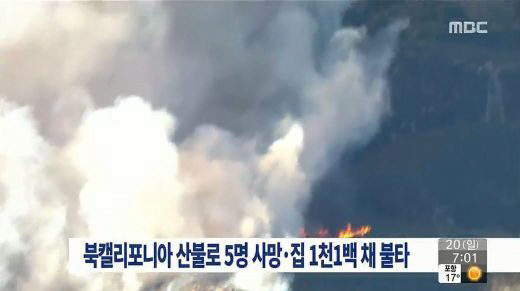 한편 최근 며칠간은 캘리포니아 북부의 기온이 낮아 불길이 주춤했으나, 이번 주말에는 기온이 35∼38도 수준으로 올라가서 화재가 확산할 것으로 예상된다. <스포츠조선닷컴>